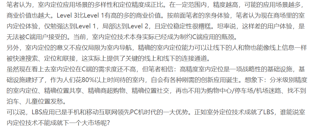 據有關統(tǒng)計,人的一生80%以上的時間在室內,移動通信服務80%發(fā)生在室內,80%的信息與時間和位置有關,想必室內定位也具有做大的潛力。正是看好這個方向,從2011年前后開始,國際、國內眾多室內定位創(chuàng)業(yè)公司如雨后春筍般出現(xiàn),頂級互聯(lián)網公司也開始布局室內定位技術。