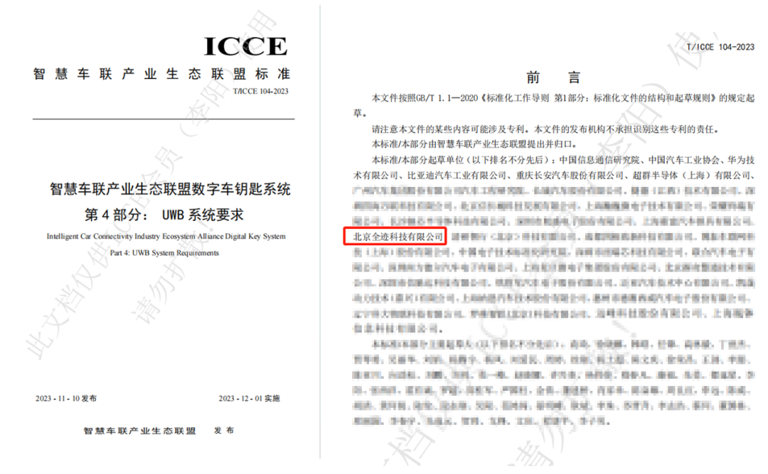 二、全跡科技參編制定國內首個系統級UWB數字車鑰匙標準,即智慧車聯產業生態聯盟(ICCE)標準:《數字車鑰匙系統 第4部分:UWB系統要求》。該標準由中國信息通信研究院、中國汽車工業協會牽頭起草,2023年11月10日發布,2023年12月1日實施。