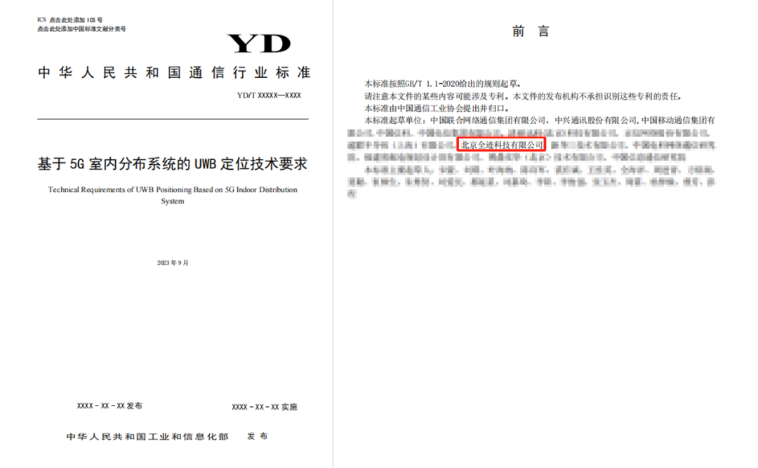 三、全跡科技參編制定《室內定位系統測試方法》,該標準由中國通信標準化協會牽頭,移動、聯通、信通院等企業參與起草。標準描述了室內定位系統的測試環境及性能、系統功能的測試方法。該標準于2023年7月28日由中華人民共和國工業和信息化部發布,2023年11月1日實施。