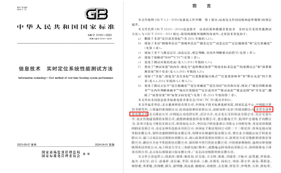 一、全跡科技參編制定國家標準《信息技術 實時定位系統性能測試方法》。該標準由國家市場監督管理總局、國家標準化管理委員會于2023年9月7日發布,計劃2024年4月1日實施。標準規定了實時定位系統的性能測試要求和測試方法,可為實時定位系統產品進行測試檢驗或認證服務提供有效指導。