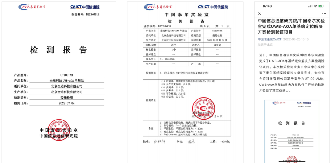 中國信息通信研究院/泰爾實驗室完成了對全跡UWB-AOA產品的檢測驗證,并在其官方微信公眾號上推薦。