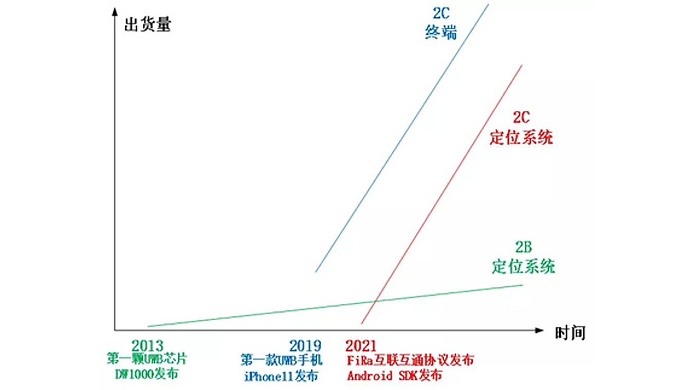很多人說:新機(jī)會(huì)產(chǎn)生在行業(yè)變革期,UWB行業(yè)此刻就在發(fā)生大變革。從13年愛爾蘭Decawave(20年初被Qorvo收購)發(fā)布第一顆UWB芯片DW1000開始,很多公司基于該芯片做自己的UWB定位系統(tǒng);與大多數(shù)B端行業(yè)類似,UWB行業(yè)整體是平緩上升的曲線(圖中綠色線),是做項(xiàng)目的模式,不被大多數(shù)投資機(jī)構(gòu)看好。